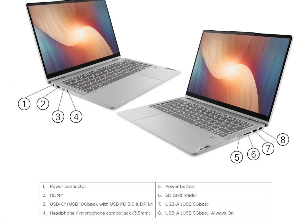 | Standartné porty | 1x USB-A (USB 5Gbps / USB 3.2 Gen 1), Always On 1x USB-C (USB 10Gbps / USB 3.2 Gen 2), with USB PD 3.0 and DisplayPort™ 1.4 1x USB-A (USB 5Gbps / USB 3.2 Gen 1) 1x HDMI 1.4b 1x SD card reader 1x Headphone / microphone combo jack (3.5mm) 1x Power connector |