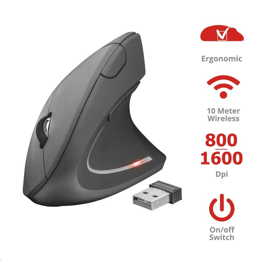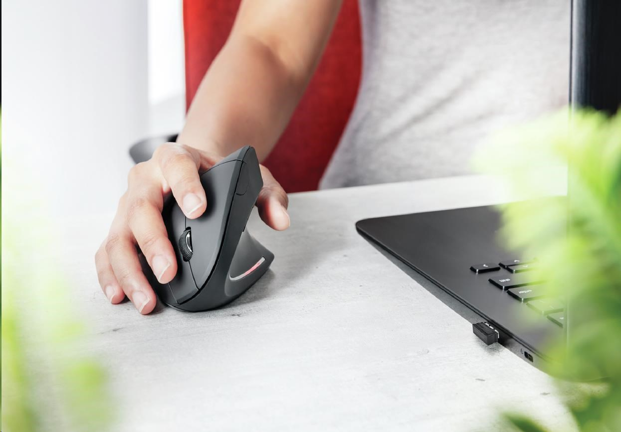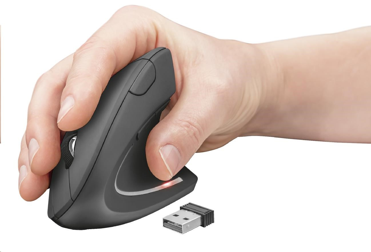 Vďaka ergonomickému dizajnu a pohodlnej opierke na palec môžete bez námahy pracovať alebo študovať celé hodiny v kancelárii alebo doma. Vďaka vertikálnemu usporiadaniu sa podpažie a zápästie dostáva do prirodzenej polohy, ktorá uvoľňuje svaly ruky, zápästia a ramena. Gumový poťah tejto myši zaručuje, že váš úchop zostane pevný aj pri dlhšej práci.