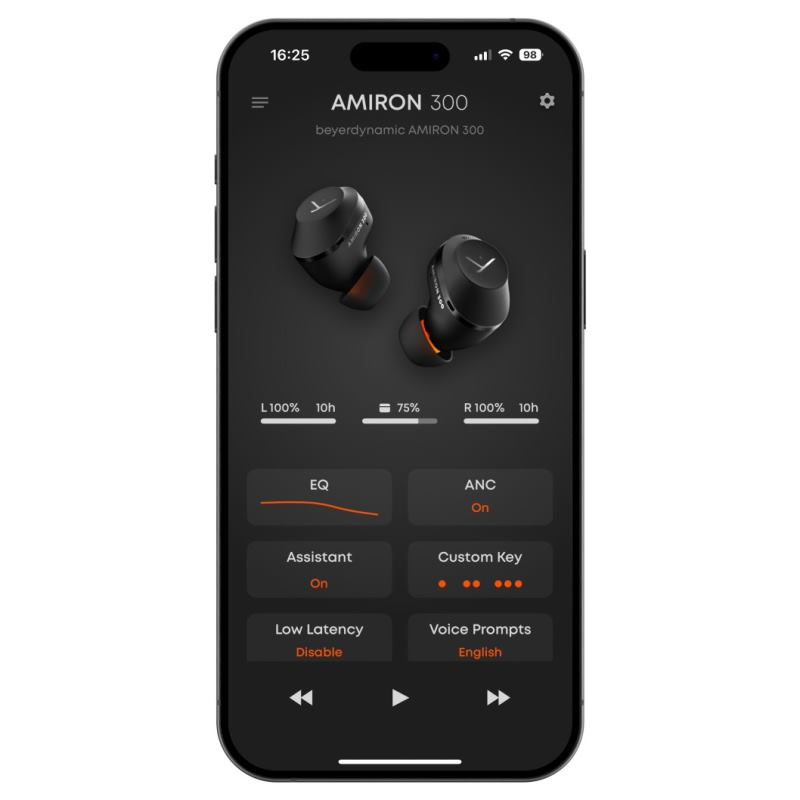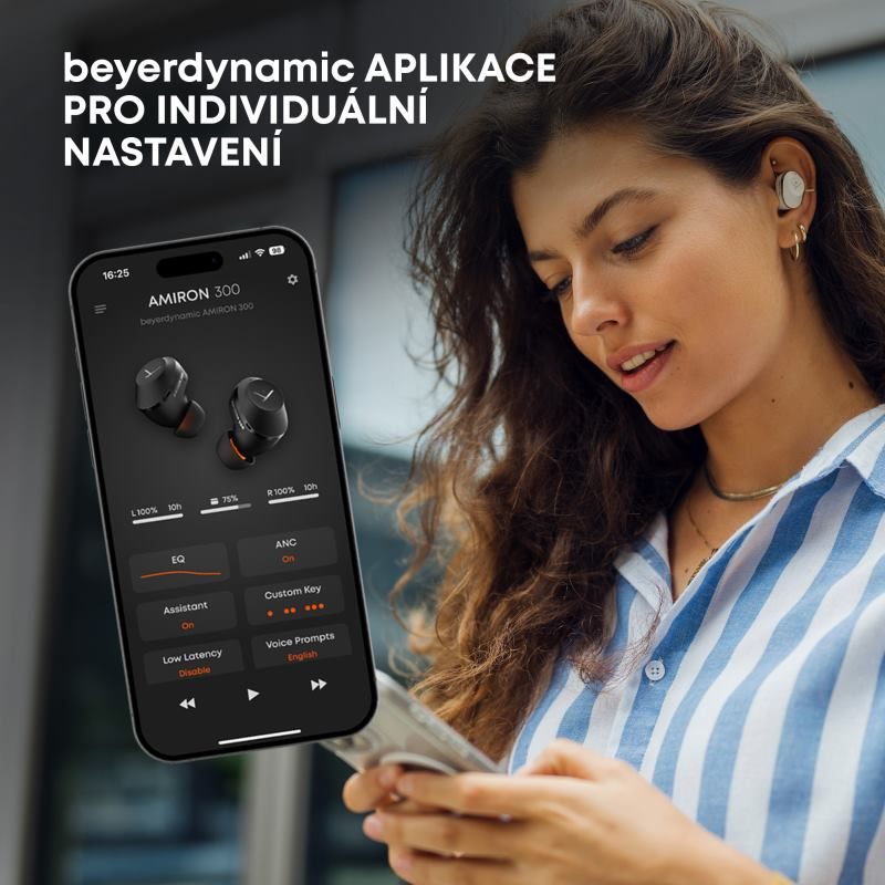Stiahnite si aplikáciu beyerdynamic a staňte sa pánom svojho zvuku. Upravte si basy, zvýraznite výšky a vytvorte si vlastný zvukový profil pomocou 5-pásmového ekvalizéra. AMIRON 300 sa prispôsobia vám, nie naopak.