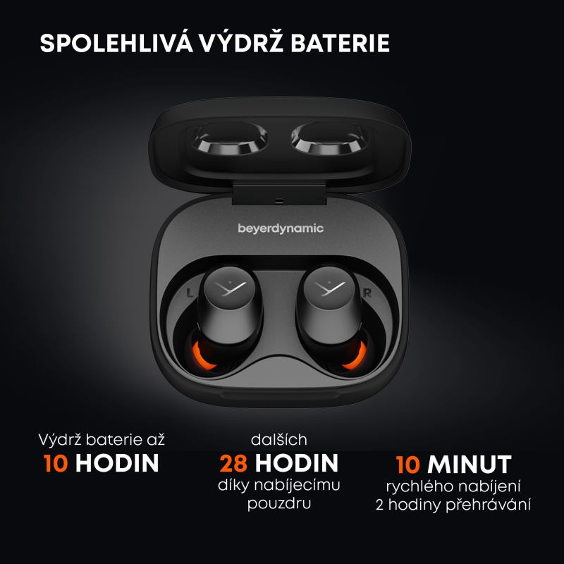 Energia na celý deň (aj noc): Až 10 hodín počúvania na jedno nabitie a ďalších 28 hodín v elegantnom nabíjacom puzdre. A keď sa ponáhľate? Len 10 minút nabíjania vám dodá energiu na 2 hodiny hudby. AMIRON 300 sú vždy pripravené.