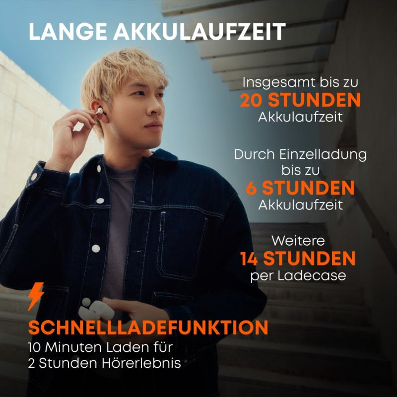 S celkovou dobou prehrávania až 20 hodín sú AMIRON ZERO pripravené na váš deň! Nabíjanie je rýchle a jednoduché pomocou USB-C kábla. A keď sa ponáhľate, 10-minútové nabíjanie vám poskytne ďalšie dve hodiny počúvania.