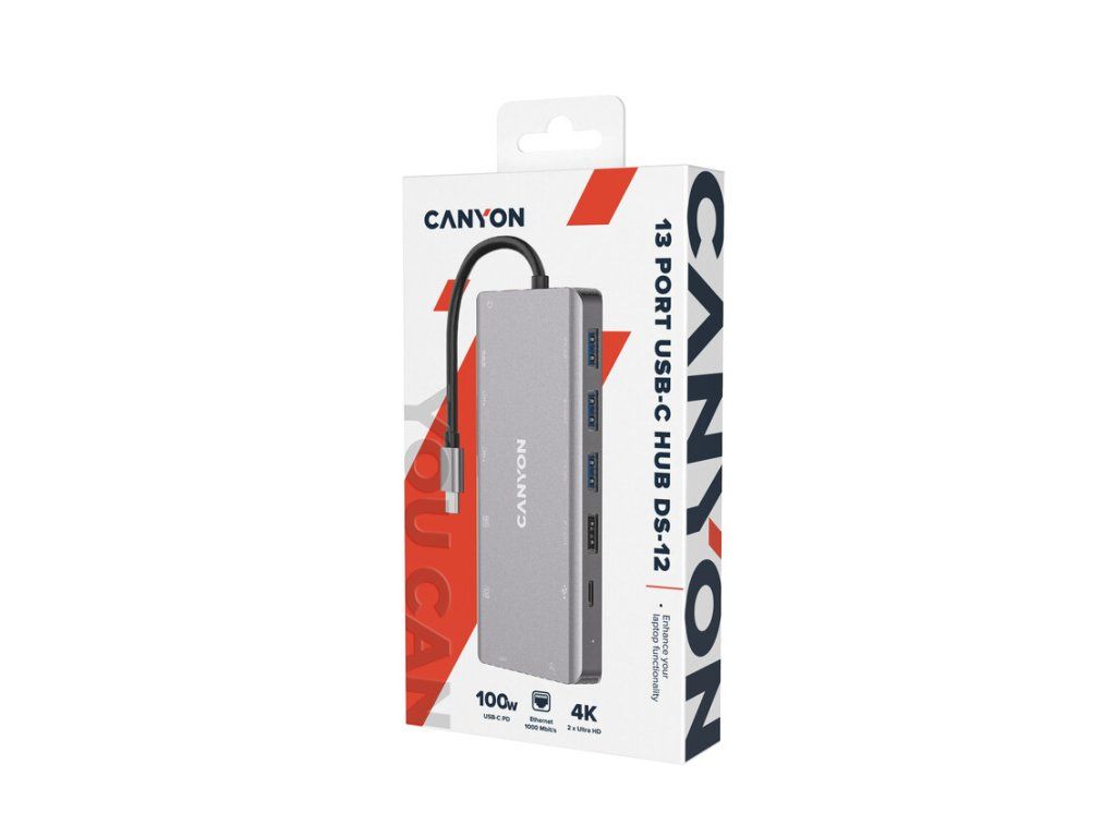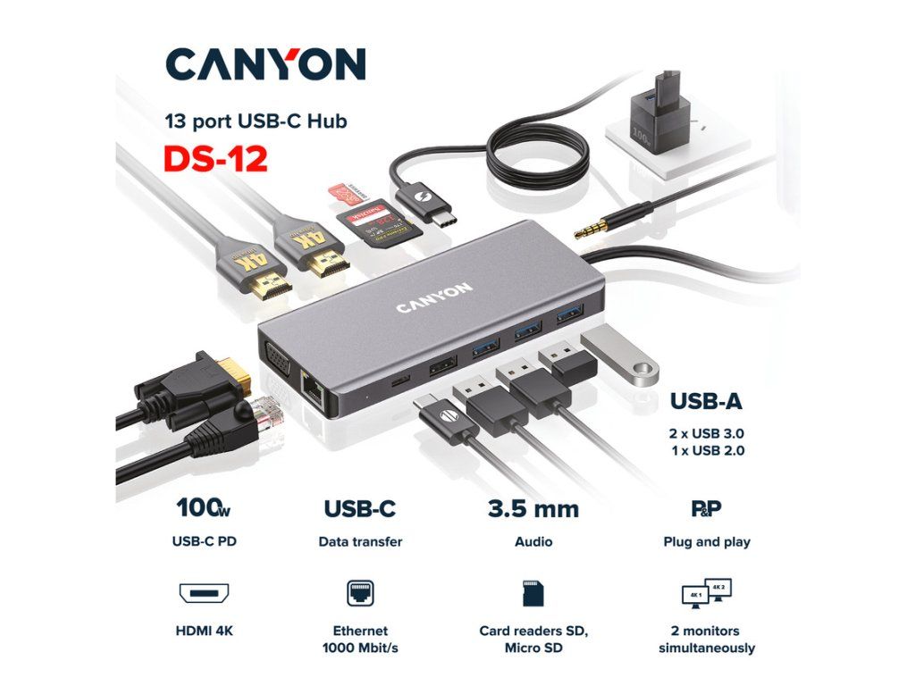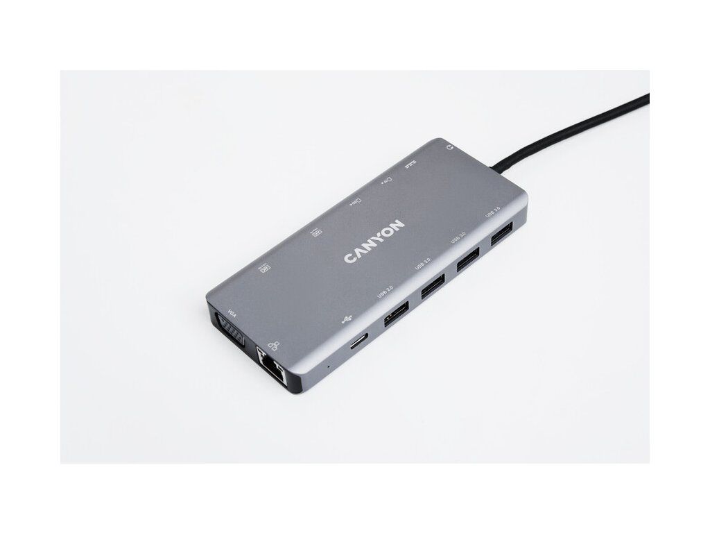 Canyon DS-12, Multiport Docking Station, 13 portov, 1xUSB-C 100W+3xUSB3.0+1xUSB 2.0+2xHDMI+1xVGA+1xRJ45+1xaudio 3,5mm