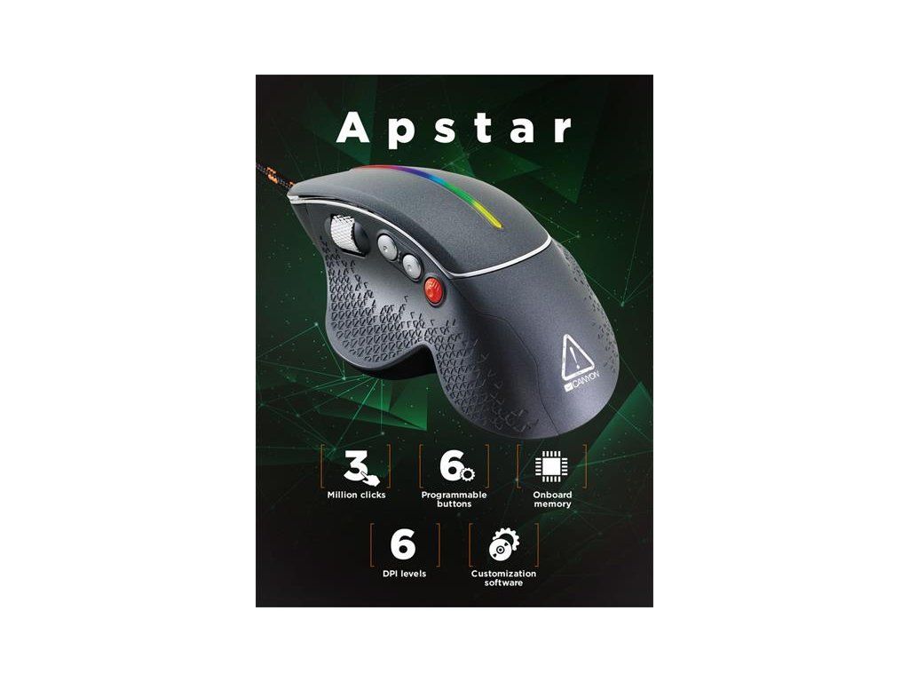Canyon Apstar, GM-12 herná myš, drôtová, optická, 800-6400 dpi, 6 program. tlač, bočné scroll, LED podsv.