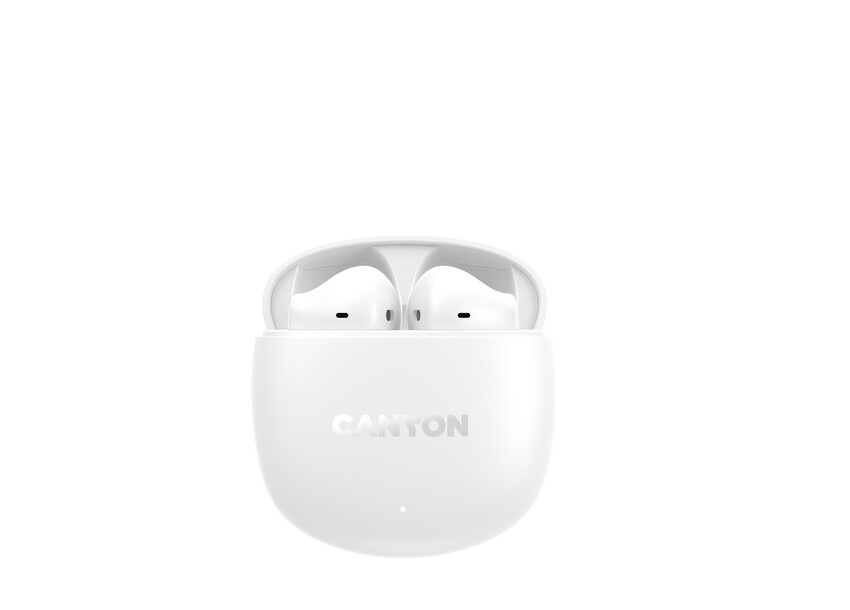 Popis Canyon OnGo 13, TWS BT 5.4 slúchadlá do uší, USB-C nabíjanie, nabíjacia stanica, kompaktné, nízka hmotnosť, biele