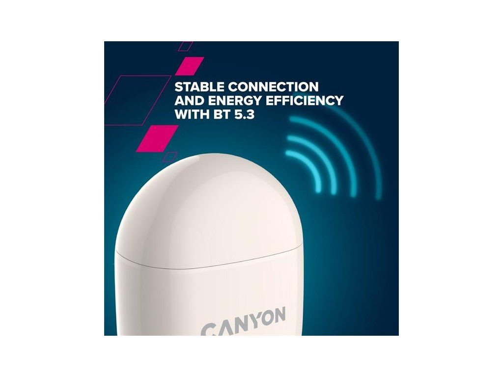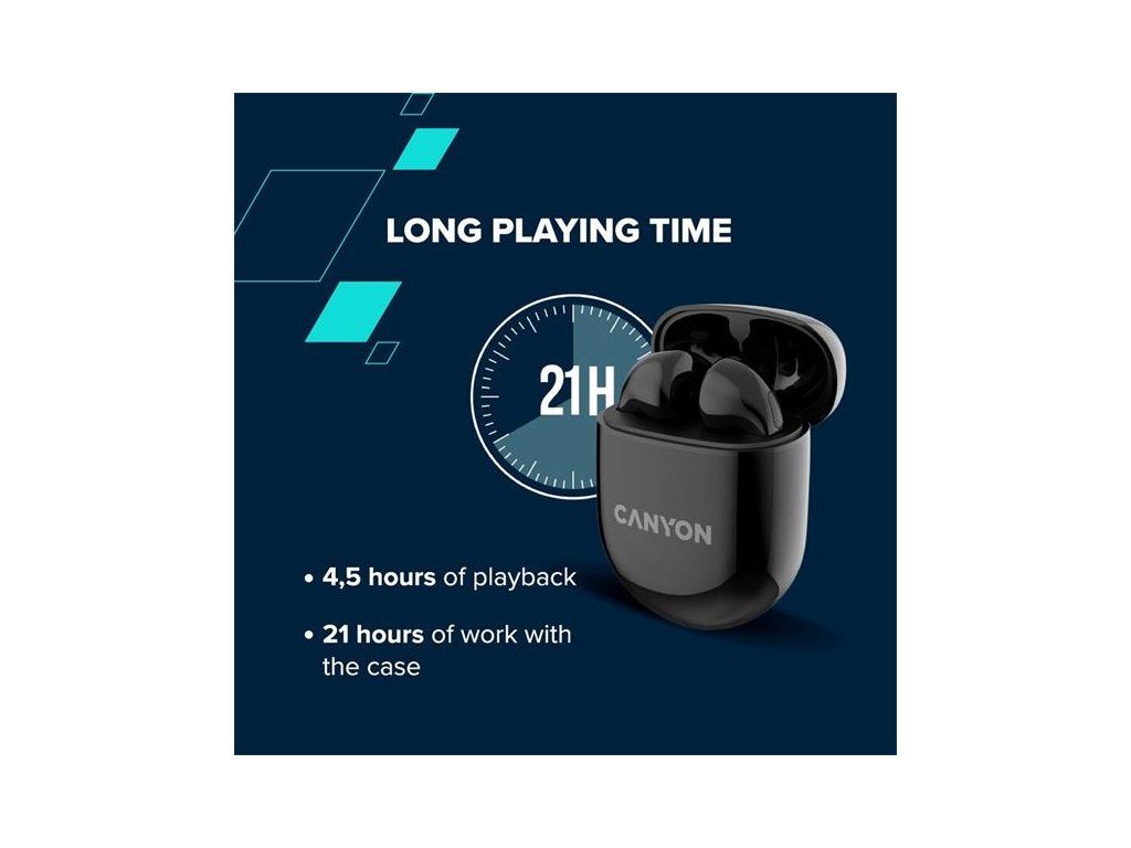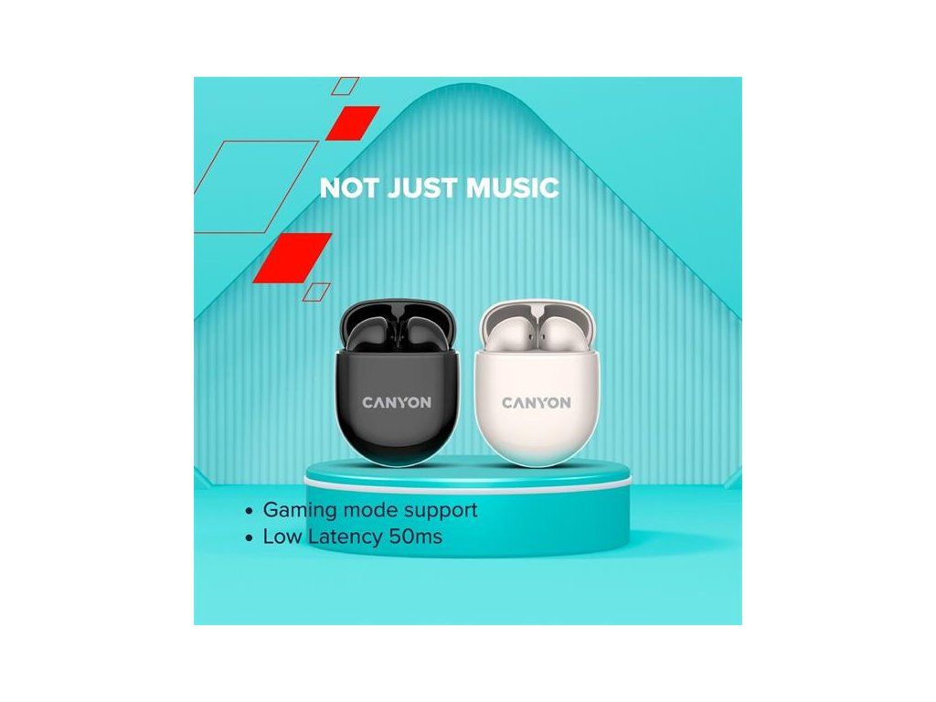 V dnešnej dobe sa sa na trhu skutočných bezdrôtových slúchadiel (TWS) ľahko môžete stratiť, ale nebojte sa – existuje výborné riešenie práve pre vás. Canyon TWS-6 je správnou voľbou pre každého, kto hľadá skvelý zvukový zážitok na cestách. Štuple sú ľahké a do ucha sadnú veľmi pohodlne. Výdrž batérie je pôsobivá, až 4,5 hodiny prehrávania na jedno nabitie. S nabíjacím puzdrom môžete získať až 21 hodín. Ak to nestačí, nabite ho iba za dve hodiny pomocou akéhokoľvek kábla USB-C. Ovládanie je intuitívne a používanie jednoduché. Konektivita Bluetooth 5.3 je spoľahlivá a energeticky efektívna, vďaka čomu umožňuje udržiavať stabilné pripojenie k telefónu alebo iným zariadeniam. Vďaka nízkej latencii 50 ms sú tieto slúchadlá vhodné aj na hranie hier. Slúchadlá sú vynikajúcou voľbou pre všetkých, ktorí hľadajú skvelý zvukový zážitok!VLASTNOSTI / ŠPECIFIKÁCIE