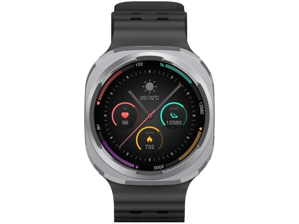 Parametry: *Materiál: Kov + silikonový náramek *Baterie: 400 mAh *Displej: 1,43'' dotykový HD AMOLED *Rozlišení: 466 x 466 *Verze Bluetooth: V 5.3 *Voděodolnost: IP 67 *Velikost hodinek: 45 mm *Tloušťka hodinek: 12 mm *Šířka řemínku: 25 mm *Hmotnost: 68 g *Notifikace: volání, zprávy, fcb atd. *Telefonování: přímo z hodinek *Sportovní režim: ano *Podporované sporty: Chůze, běh, lezení, jízda na kole, basketbal, badminton, fotbal, eliptický trenažér a další. *Měřené veličiny: Nadpis *Krokoměr: ano *Měření vzdálenosti: ano *Měření krevního tlaku: ano *Měření okysličení krve: ano *Měření spálených kalorií: ano *Kardio index: ano *Úroveň stresu: ano *Výpočet BMI: ano *Monitor Spánku: ano *Energie těla: ano *Aplikace: Carneo FIT v českém jazyce *Životnost baterie: 7 dní *Přehrávání hudby: Ovládání hudebního přehrávače v mobilním telefonu