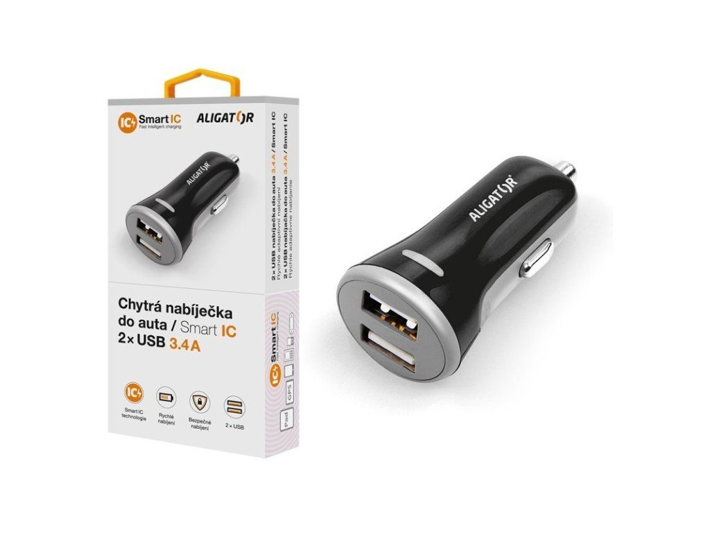 Chytrá nabíječka do auta ALIGATOR 3.4A, 2xUSB, smart IC, černá Nová výkonná nabíječka do auta řady „SMART IC“ v černém provedení, dvěma USB porty s výstupní kapacitou 3.4A. Tato nabíječka je ideální pomocníkem pro dobíjení mobilního telefonu a jiných zařízení prostřednictvím cigaretového zapalovače. Chytrá nabíječka zvládne doplnit energii až dvěma přístrojům najednou, navíc je vybavena chytrým čipem pro rychlé nabíjení. Až 5x rychlejší nabíjení oproti běžné USB nabíječce. Funkce Smart IC automaticky detekuje typ připojeného zařízení a přizpůsobí nabíjecí proud a napětí tak, aby se nabilo co nejrychleji. Kompatibilní s většinou zařízení s USB portem. Technické údaje: • Vystup: DC 12-24V • Výstup: DC 2x5V 2.4A (max 3.4A celkem) • SMART IC – rychlé adaptivní nabíjení • Ochrana proti zkratu a přetížení • Barva: černáDodatočné parametre