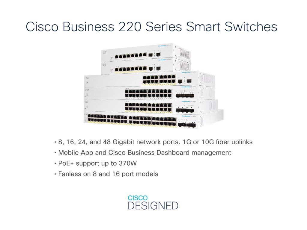 CBS220-24P-4X - Cisco Business 220 Ethernet Switch Řada Cisco Business 220 jsou cenově dostupné inteligentní přepínače se snadným použitím, zabezpečením a spolehlivostí pro sítě podnikové třídy. Díky intuitivnímu palubnímu panelu, možnostem napájení přes Ethernet (PoE) a přizpůsobitelným funkcím poskytují tyto přepínače spolehlivou obchodní síť v rámci vašich rozpočtových parametrů. Pokud potřebujete síť na špičkové úrovni a cena je nejvyšší prioritou, nabízí řada Cisco Business 220 vynikající řešení.