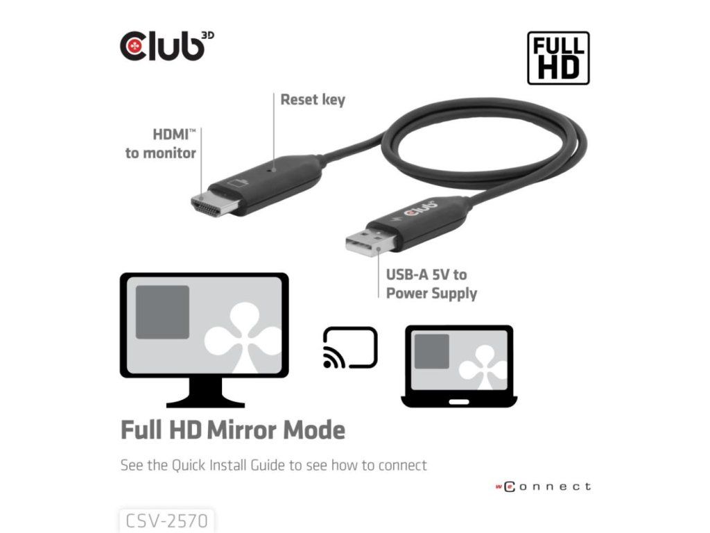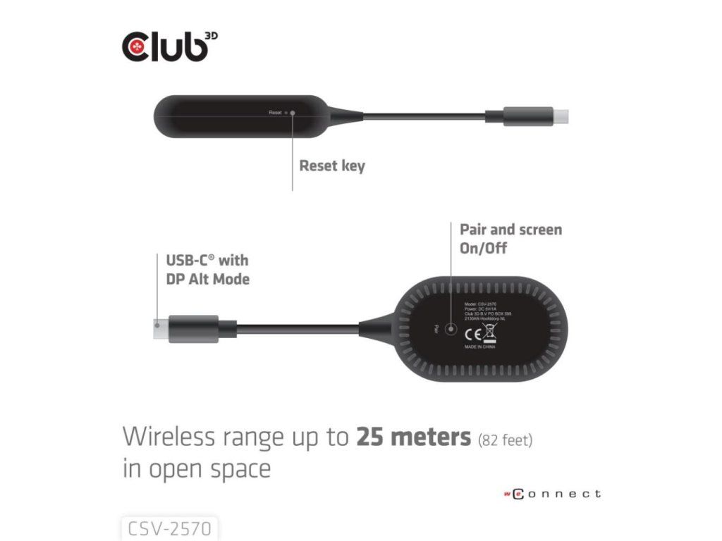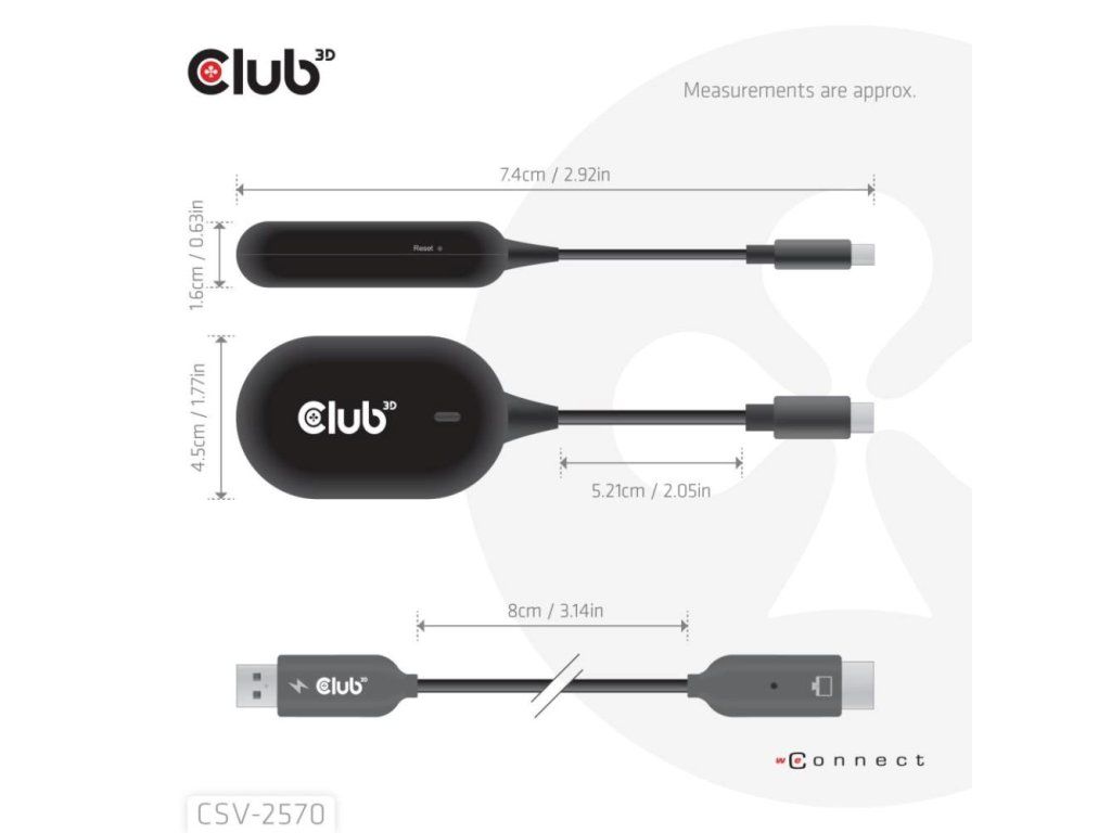 Club 3D CSV-2570 je prvé bezdrôtové zariadenie s technológiou HDMI. Pomocou vysielača a prijímača bezdrátovo prenáša video a zvuk vo FullHD kvalite z zariadenia s USB-C na HDMI displeje.