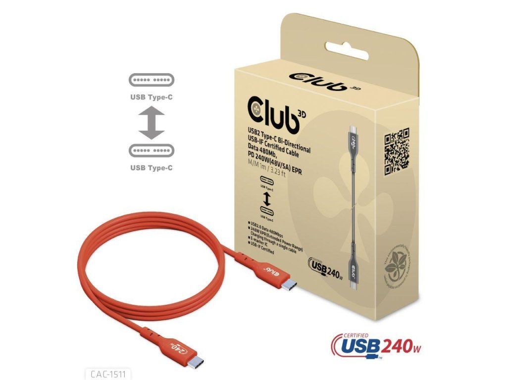 Club3D kabel USB-C, Oboustranný USB-IF Certifikovaný data kabel, PD 240W(48V/5A) EPR M/M 1m