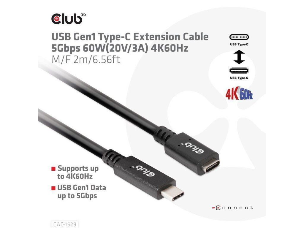 Predlžovací kábel Club 3D CAC-1529 USB Gen1 Type-C 5Gbps 60W(20V/3A) 4K60Hz M/F 2m/6.56ft pripojí váš notebook, tablet alebo telefón s výstupom USB typu C k vašim obľúbeným existujúcim periférnym zariadeniam, príslušenstvu a nabíjačkám. Umožňuje prenos videa, dát a napájania cez jeden kábel a oboma smermi. Tento kábel podporuje USB Gen1 Video až do 4K60Hz, dáta až do 5Gbps a výstup až do 60Watt(20V/3A) na Downstream nabíjanie alebo napájanie notebooku, tabletu alebo smartfónu.