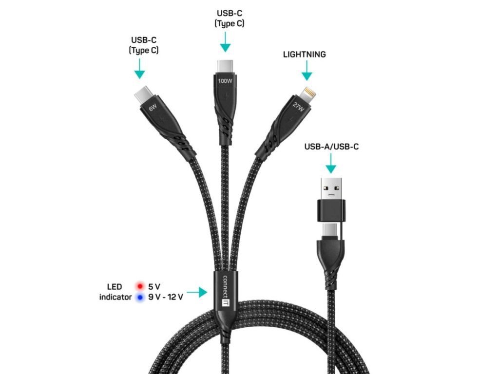 CONNECT IT Nabíjecí kabel Wirez 6v1, USB-C/USB, Lightning + 2x USB-C, 1.25m, černá