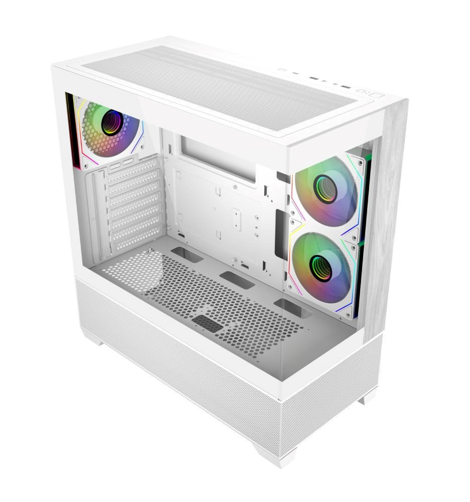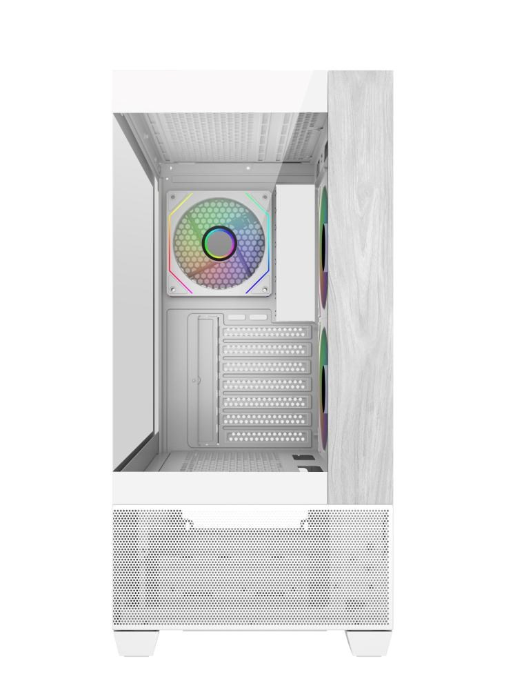Model Elite 690 má čistý a moderný dizajn a je vybavený dvoma panelmi z tvrdeného skla na prednej a bočnej strane, ktoré prezentujú prémiové komponenty a osvetlenie RGB. Predný panel kombinuje prírodný akcent s textúrou dreva so spodným sťahom zo sieťoviny, čo prináša nielen estetickú teplo, ale aj efektívne prúdenie vzduchu. Vďaka rozsiahlemu vetraniu na hornej a spodnej strane podporuje skriňa univerzálnu konfiguráciu ventilátorov a chladičov, ktoré umožňujú výkonné vertikálne chladenie. Či už staval vysoko výkonnú prezentáciu alebo štýlovú stolnú zostavu, Elite 690 ponúka dokonalú rovnováhu medzi funkčnosťou a formou.