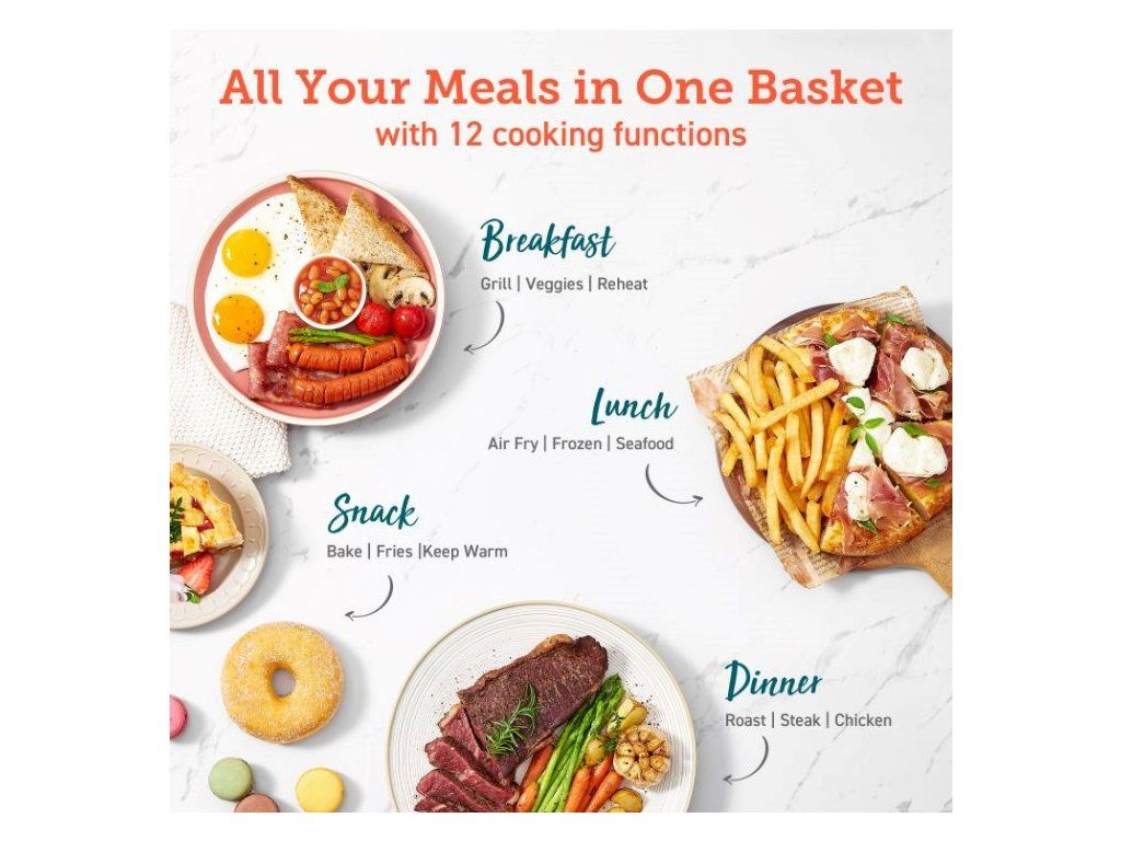 Nechajte horkovzdušnú fritézu robiť prácu za vás s funkciami varenia jedným dotykom, ako je smaženie horúcim vzduchom, pečenie, grilovanie, opekanie, ohrievanie, kuracie, steaky, morské plody, zelenina, hranolky, mrazené a udržiavanie jedla v teple. Preskúmajte ďalšie možnosti prispôsobením vlastných funkcií varenia s preferovaným časom a teplotou.