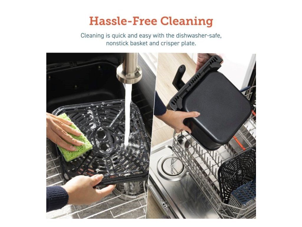 Vyjímateľný fritovací koš a nádoba sú vyrobené z odolného, nepriľnavého a zdravotne nezávadného materiálu (BPA a BFOA FREE) a je možné ich umývať v umývačke riadu. Vždy vychladená rukoväť a tlačidlo na uvoľnenie koša eliminujú riziko popálenia a nechceného uvoľnenia.