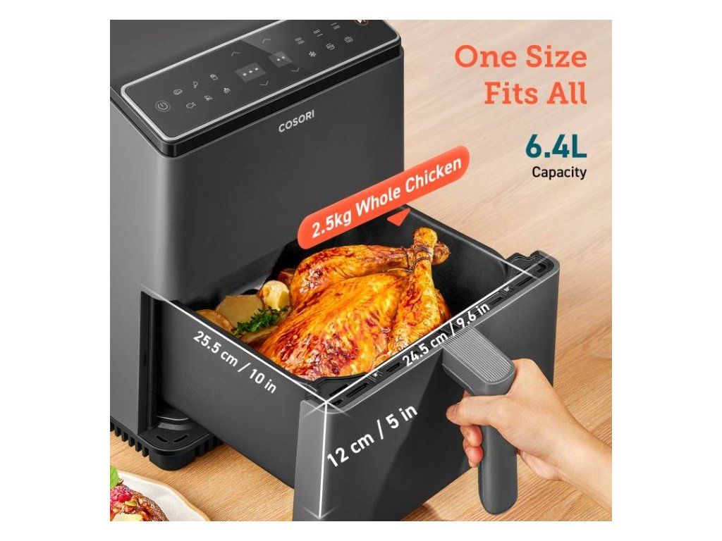 Horkovzdušná fritéza COSORI CAF-P583S sa pýši obrovským objemom koša 6,4 litra s praktickým štvorcovým tvarom, vďaka čomu uspokojí aj početnejšie domácnosti. S výkonom 1700 W je fritéza mimoriadne výkonná, čo skracuje dobu varenia a šetrí elektrickú energiu. Vďaka veľkosti varného priestoru je možné pripraviť napríklad celé 3,5 kg kura v kuse alebo 17 kusov kuracích krídel, ktoré by sa do fritézy s kruhovým košom alebo objemom 3-4l ťažko zmestili.