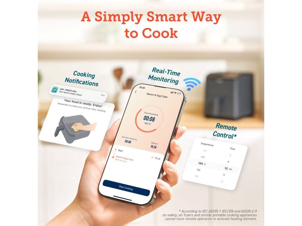 Vďaka SMART ovládaniu môžete jedlá pripravovať pomocou svojho smartfónu. Jednoducho si stiahnite bezplatnú aplikáciu z Google Play alebo App Store. V aplikácii môžete voliť jednotlivé programy, prehliadať recepty, sledovať priebeh prípravy jedla alebo nastaviť upozornenia. Fritéza je tiež kompatibilná s Amazon Alexa a Google Asistant.