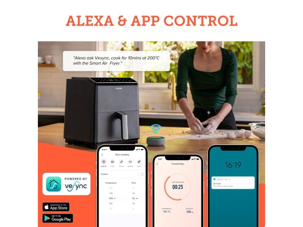 S horkovzdušnou fritézou COSORI CAF-P583S SMART si môžete vychutnať vaše obľúbené vyprážané jedlá bez výčitiek, pretože na rozdiel od bežného vyprážania alebo fritovania je v tejto horkovzdušnej fritéze možné pripravovať jedlá s použitím veľmi malého množstva oleja alebo vôbec žiadneho. Patentovaná technológia THERMO IQ 360° HEAT CIRCULATION presne reguluje teplotu inteligentným teplotným algoritmom a zabezpečuje tak rovnomerné uvarené jedlo bez nutnosti jeho pretierania alebo otáčania. Kombinácia cirkulujúceho horúceho vzduchu, dokonalé teploty varenia a chytrých programov zabezpečí, že hranolky budú vždy krásne chrumkavé a kuracie stehná šťavnaté. Programy si môžete rýchlo a pohodlne nastaviť aj prostredníctvom smartfónu alebo Amazon Alexa a Google Assistant. Až budete mať hotovo, čistenie bude rovnako jednoduché vďaka nepriľnavému košu, ktorý je možné umývať v umývačke riadu. Vďaka veľkej nádobe s objemom 6,4l navyše môžete rýchlo uvariť aj pre väčšiu rodinu alebo skupinu hostí.
