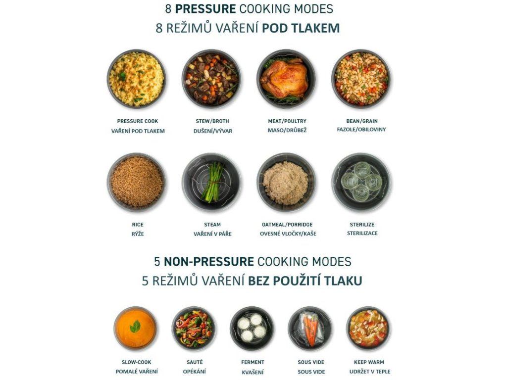 - Tlakové varenie, ryža, para, ovsené vločky/kaša, dusené mäso/vývar, fazule/zrno, mäso/kurča, jogurt, koláč, pomalé varenie, soté, Sous Vide, udržiavanie teploty
