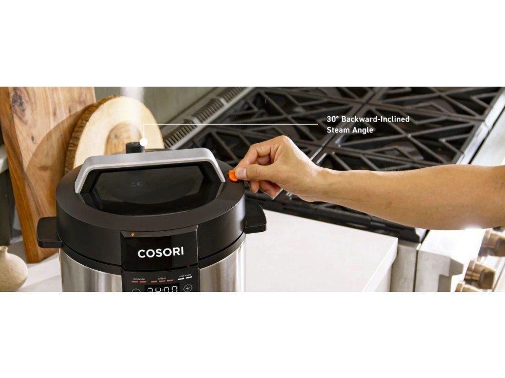 Tlačidlo Seal/Vent je umiestnené mimo ventilu na vypúšťanie pary, zatiaľ čo ovládač na vypúšťanie pary je umiestnený 30° vzadu, čo zabezpečuje bezpečné a jednoduché odvetrávanie. Tlakový hrniec Cosori Multicooker CMC je vybavený dvojvrstvovým vekom proti popáleniu a ochranou proti prehriatiu pre väčšiu bezpečnosť