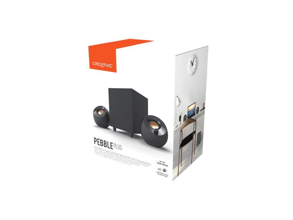 Creative Pebble Plus jsou následníkem svého kompaktního, ale výkonného předchůdce, který byl oceněn jako Nejlepší počítačové reproduktory roku 2018 od společnosti PC Mag. Reproduktory jsou nastaveny pod úhlem 45° a jsou doprovázeny subwooferem, který propouští křišťálově čistou hudbu a hlasitější a teplejší basy. Získejte maximum ze svého PC zvuku pomocí dynamických výšek a pulzujících basů pro pohlcující zvukový zážitek.Technické parametry *Rozměry: satelity 116 x 122 x 115 mm, subwoofer 150 x 195 x 202 mm *Celkový výkon systému: Až 8 W RMS *Frekvenční odezva: 50 Hz ~ 20 kHz *Konfigurace systému: 2.1 systém *Poměr signál-šum (SNR): 75 dB *Typ konektoru: AUX-in, USB
