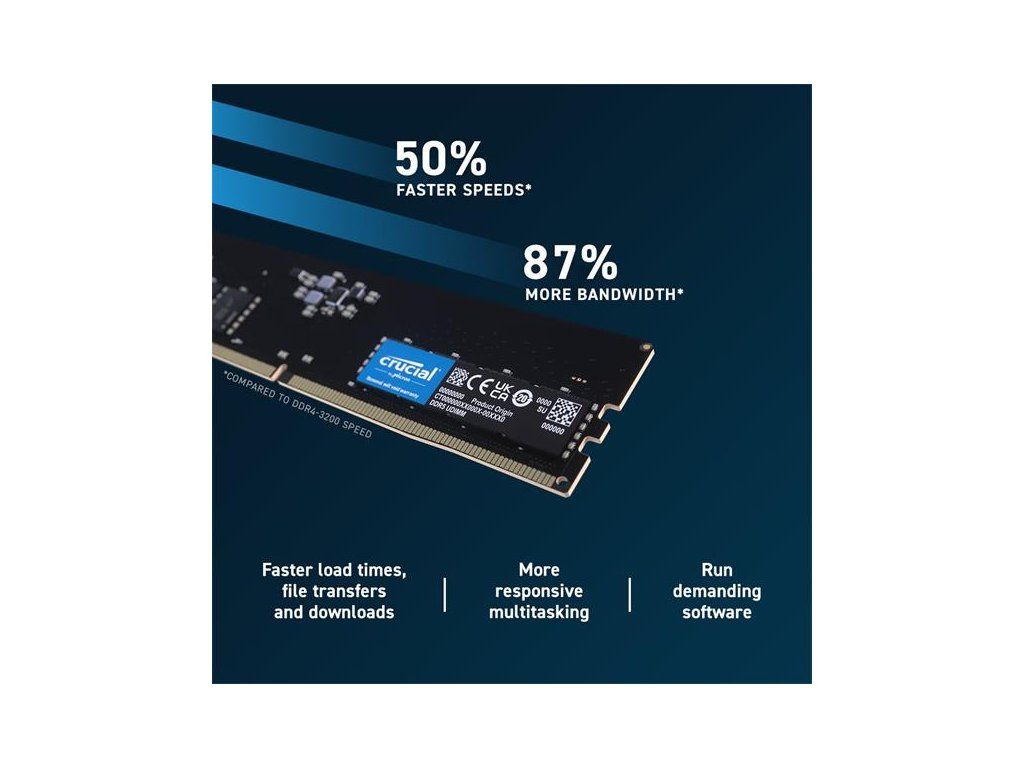 Pamäť Crucial DDR5 pre stolné počítače dokáže pri uvedení na trh umožniť vášmu počítaču preniesť o 50 % viac dát ako DDR4, čo má za následok rýchlejšie načítavanie, prenos súborov, sťahovanie, obnovovacie frekvencie a menšie oneskorenie.Rýchlejšie načítanie a prenos súborov
