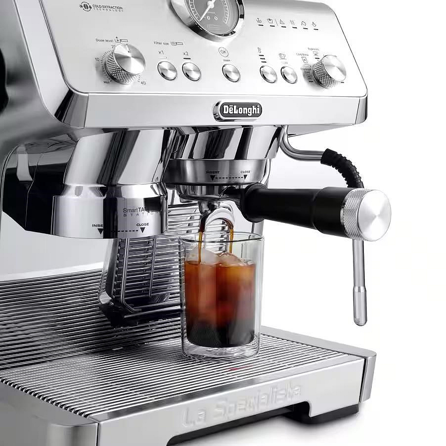DeLonghi La Specialista Opera pákový kávovar, 1550 W, vestavěný mlýnek, parní tryska MyLatte, nerez