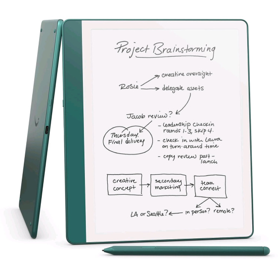 Nový Kindle Scribe - Kindle a notebook, vše v jednom. Přepracovaný zapuštěný přední displej s jednotnými bílými okraji a vylepšeným perem Premium Pen, jako byste psali na papír. Pište do knih jako inspirace – Začněte psát přímo na stránku a Active Canvas vytvoří prostor pro vaše poznámky. Vestavěný notebook – Vytvářejte poznámky ze schůzek a seznamy úkolů nebo deník na jednom místě. Převeďte ručně psané poznámky na text a pošlete je e-mailem sobě nebo svým kontaktům. Souhrny notebooků – Snadno shrňte a upřesněte své poznámky pomocí nových vestavěných nástrojů pro notebooky AI. Čtěte a pište za jakéhokoli světla – 10,2'' neoslňující displej s předním podsvícením 300 ppi je určen pro čtení a psaní kdykoli, uvnitř i venku. Žádné rušivé vlivy – Zaměřte se na své myšlenky pomocí zařízení speciálně navrženého pro čtení, psaní a označování dokumentů. Žádná upozornění ani sociální média. Včetně prémiového pera – není třeba nastavovat ani nabíjet, stačí začít psát. Vylepšený design, tlačítko zkratky a měkká guma poskytují dokonalého společníka při psaní. - Display Technologie displeje Amazon 10,2” Paperwhite s vestavěným světlem, 300 ppi, optimalizovaná technologie písma, 16úrovňová stupnice šedé. - Velikost Zařízení: 196 x 230 x 5,7 mm bez nožiček Premium Pen: 162 x 8,8 x 8,4 mm - Hmotnost Zařízení: 433 g Premium Pen: 17 g - Wi-Fi připojení Podporuje sítě 2,4 GHz a 5,0 GHz s podporou zabezpečení WEP, WPA, WPA2 a WPA3 pomocí ověřování heslem nebo Wi-Fi Protected Setup (WPS). Nepodporuje připojení k ad-hoc (nebo peer-to-peer) sítím Wi-Fi. - Podporované formáty obsahu Kindle Format 8 (AZW3), Kindle (AZW), TXT, PDF, nechráněné MOBI, PRC nativně, PDF, DOCX, DOC, HTML, EPUB, TXT, RTF, JPEG, GIF, PNG, BMP prostřednictvím konverze, Zvukový formát zvuku (AAX). - Obsah balení Obsahuje Kindle Scribe s podporou wifi, prémiové pero, nabíjecí kabel USB-C, 5 náhradních hrotů, nástroj pro výměnu hrotu a vestavěnou dobíjecí baterii. - Výdrž baterie Při čtení vydrží na jedno nabití až 12 týdnů na základě půlhodiny čtení denně, s vypnutým bezdrátovým připojením a nastavením světla na 13. Při psaní vydrží na jedno nabití až 3 týdny na základě půlhodiny psaní za den, s vypnutým bezdrátovým připojením a nastavením světla na 13. Výdrž baterie se bude lišit a může být snížena v závislosti na používání a dalších faktorech, jako je streamování audioknih Audible a komentování obsahu. - Doba nabíjení Plně se nabije přibližně za 7 hodin z počítače pomocí kabelu USB-C, nebo se plně nabije přibližně za 2,5 hodiny pomocí 9W napájecího adaptéru USB-C.