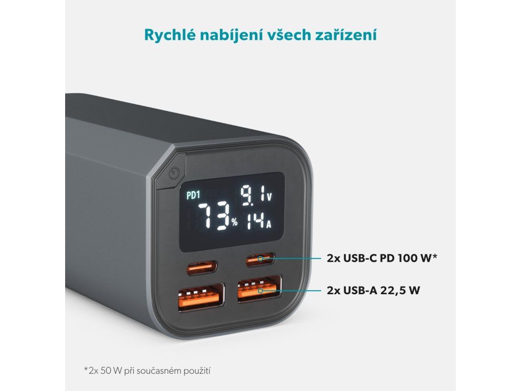 Výkonná a elegantní – ultimátní 100W powerbanka Vysoká kapacita: Baterie s kapacitou 20 000 mAh poskytuje dostatek energie pro opakované nabití smartphonu a tabletu, nebo udržení notebooku v chodu na cestách. LED displej: Přehledný displej v reálném čase ukazuje stav baterie, výběr vstupu i napětí/proud, abyste měli vše pod kontrolou. USB-C výstupy: Dva USB-C porty s výkonem až 100 W samostatně (50 W každý při současném použití), vhodné pro energeticky náročná zařízení. USB-A výstupy: Dva USB-A porty s výkonem až 22,5W nabízejí všestranné možnosti nabíjení. Hliníkové tělo: Prémiové a odolné provedení zajišťuje efektivní odvod tepla a optimální výkon. Kompaktní a lehká: Překvapivě malá a přenosná vzhledem ke své kapacitě, ideální na cesty.