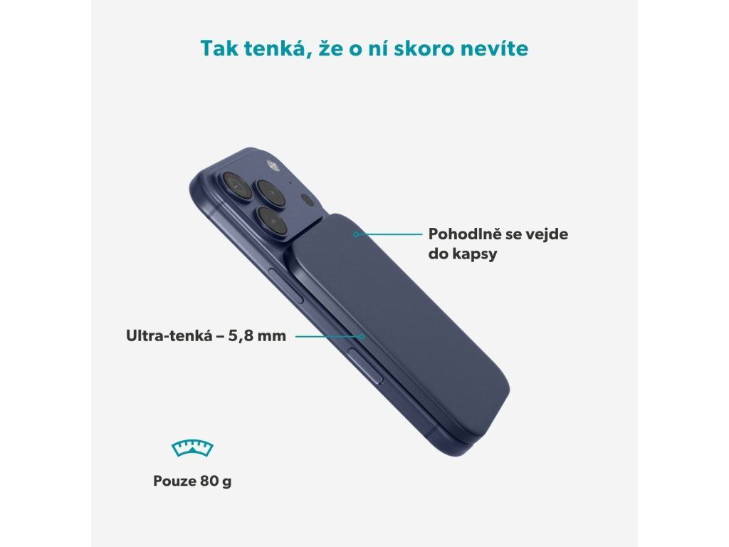 Ultratenká powerbanka pro energii vždy po ruce Epico UltraPack EM31b se díky kompatibilitě s MagSafe a Qi2 magneticky a bezpečně přichytí k telefonu a umožní pohodlné bezdrátové nabíjení bez kabelů. Ultratenké provedení s tloušťkou pouhých 5,8 mm se vejde do kapsy nebo malé tašky, takže o ní při každodenním přenášení ani nevíte. Prémiové zpracování a jistota bezpečného nabíjení Hliníkové tělo powerbanky nejen působí elegantně, ale zároveň pomáhá efektivně odvádět teplo a udržovat stabilní výkon. Přední strana z tekutého silikonu zajišťuje lepší přilnavost k zádům telefonu a podporuje účinnější přenos energie. Bezdrátový výstup s výkonem až 7,5 W doplňuje možnost nabíjení přes USB-C s výkonem až 10 W. O bezstarostné používání se stará šestinásobná ochrana proti přepětí, přebití, přetížení, nadměrnému vybití, nadproudu a zkratu, takže se můžete spolehnout na bezpečné nabíjení doma i na cestách. Součástí balení je také praktický 0,3m USB-C na USB-C kabel.