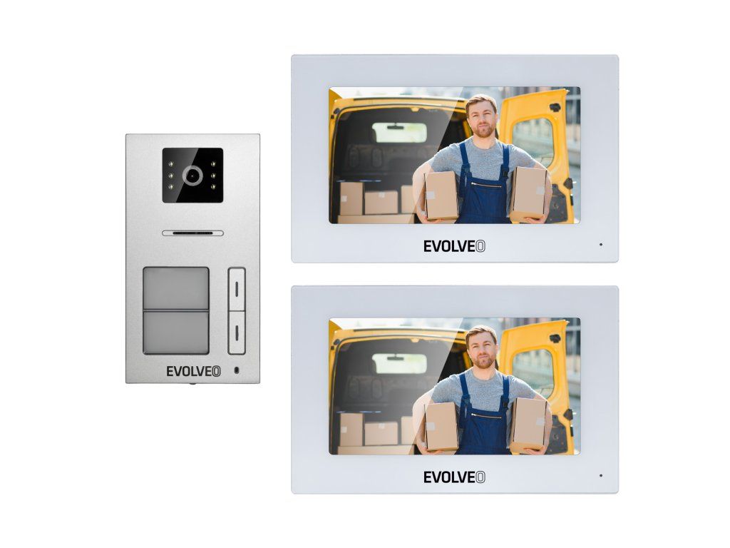 Venkovní panel odolný proti povětrnostním vlivům je vybaven 2 tlačítky a kamerou, pomocí kterých vám hosté mohou zavolat. Když host stiskne tlačítko volání na venkovní stanici, monitor zazvoní, zároveň se na obrazovce zobrazí obraz návštěvníka, vy se rozhodnete, zda dveře otevřete, nebo ne. Tato úžasná funkce vám poskytne kompletní systém kontroly přístupu. Zároveň je možné volat mezi jednotlivými monitory, stačí na monitoru zmáčknout příslušné tlačítko a spustí se hlasový hovor na druhý monitor, který může být umístěný v druhém bytě. Balení obsahuje vše co je potřeba k jednoduché instalaci dva vnitřní monitory, venkovní jednotku s kamerou, sadu šroubů a hmoždinek, svorky na kabely s páčkou.