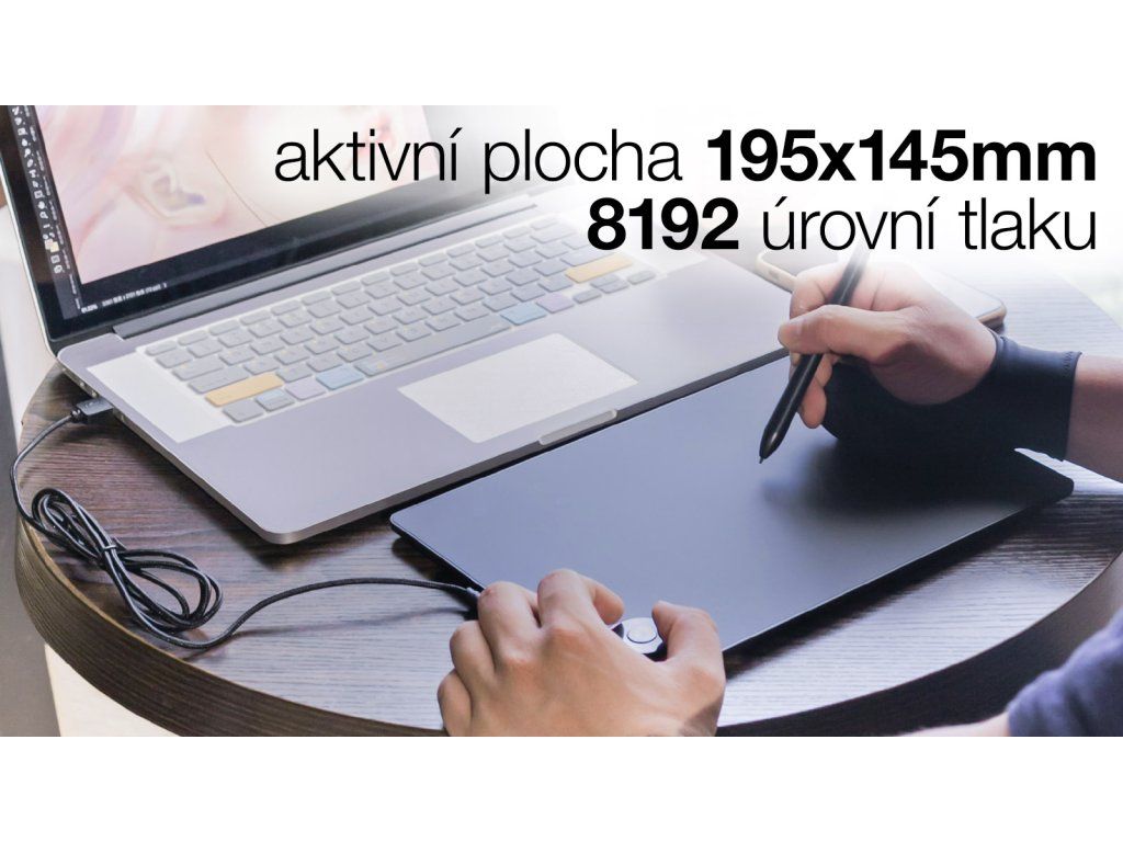 • Kompatibilita s Windows, Mac OS, Android • Pracovní plocha 195x145mm • Rozlišení 5080 DPI • Interaktivní kolečko • Bezdrátové pero s 8192 úrovní přítlaku • Implementované ovladače • Odezva 233 PPS • Napájení přes USB