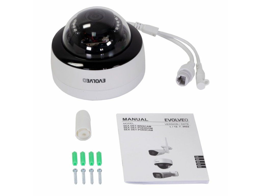 Základna kamery je vyrobena z hliníkové slitiny a kopule je z tvrzeného odolného plastu, který je odolný vůči UV záření. Lze ji montovat jak v interiérech, tak i ve venkovním prostředí. Kamera je vybavena 2Mpx snímačem, který umožňuje přenos obrazu v kvalitě FULL HD 1920x1080p, IR přísvit se skládá z 12 ks IR LED s vlnovou délkou 850nm, které vystačí na osvit prostoru do 20M od místa instalace. Součástí balení je i spojovací materiál pro snadnou montáž. Kameru lze manuálně natočit, tak aby zabírala vámi vybrané místo. Kameru lze spárovat s NVR kamerovými systémy EVOLVEO Detective řady SMART.Kameru lze použít i samostatně s jakýmkoliv kamerovým systémem, který podporuje standart ONVIF.