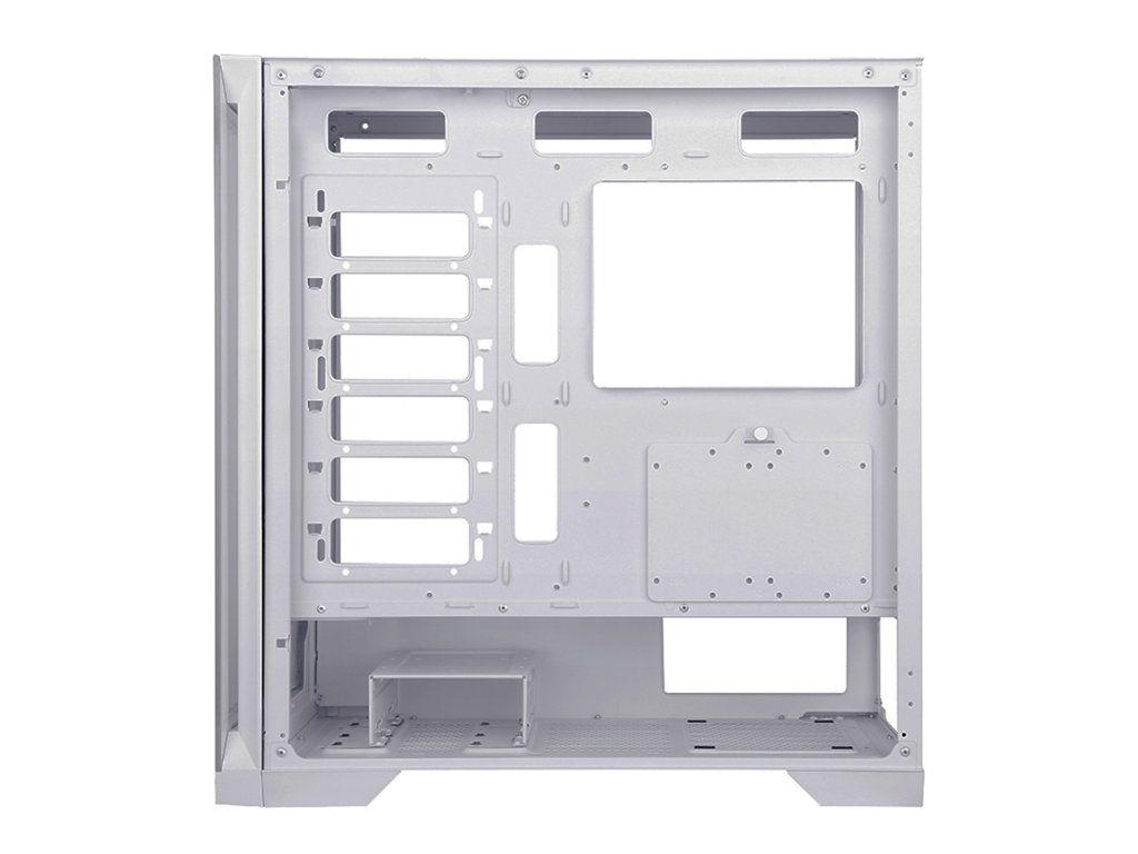 Ovládací panel na pravé horní části skříně: 1) Vypínač ON/OFF 2) Tlačítko pro ovládání ARGB ventilátorů (mění barvu podsvícení ventilátorů, aktivuje ovládání podsvícení ventilátorů prostřednictvím základní desky) 3) Modrá LED dioda signalizující zapnutí počítače 4) Červená LED dioda signalizující provoz systémového disku 5) 1 x USB-A port (v 3.0) 6) 2 x USB-A port (v 2.0) 7) 1 x audio výstupní port (Jack 3,5 mm) 8) 1x vstup na mikrofon (Jack 3,5 mm) • Speciální voštinová konstrukce průduchů skříně pro optimalizaci průtoku vzduchu • 32 mm Cable management pro skrytí kabeláže uvnitř skříně • Optimalizovaná prostorná vnitřní konstrukce pro pohodlnou montáž komponent • 7 rozšiřujících PCI slotů sloužících k montáží a vyvedení portů z rozšiřujících karet vložených do základní desky •