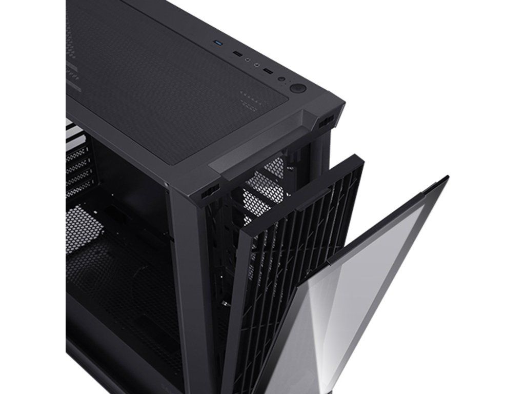 Horní prachový filtr eliminující vniknutí prachu do skříně: 1) Chrání komponenty skříně před prachem 2) Ultrajemná struktura (50 děr/cm2) pro maximální průtok vzduchu 3) Ultratenký ocelový plát o síle 0,35 mm 4) Snadná demontáž a montáž díky magnetickému uchycení • Boční průduch na pravé straně skříně (36 × 10,5 cm) pro optimalizaci průtoku vzduchu • Podporované rozměry chladičů přední i horní pozice: 120/140/240/280/360 mm • 4 protiskluzové pogumované nožičky na spodní straně skříně zamezující nechtěnému pohybu skříně • Rozměry: (š × v × h): 215 × 490 × 472 mm • Hmotnost: 7,9 kg