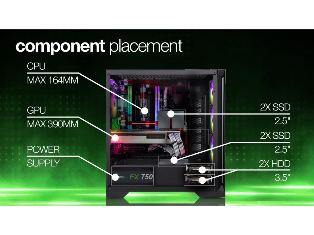 Průhledná odnímatelná bočnice: 1) Vyrobena z bezpečnostního 4 mm silného temperovaného skla (při rozbití se rozsype na bezpečné drobné kousky bez ostrých střepů) 2) Snadná demontáž a montáž pomocí dvou šroubů s dvěma možnostmi utažení (rukou nebo šroubovákem) • 2x 3,5'' HDD • 3x 2,5 '' SSD • Maximální délka VGA karty: 390 mm • Maximální výška CPU chladiče: 164 mm • Robustní konstrukce (plechy o tloušťce 0,6 mm) • Systém „QuintFlow“ pro optimální průtok vzduchu a přirozené chlazení celé skříně díky pěti vzduchovým proudům přes čelní, horní, spodní, zadní a boční voštinové průduchy • Podpora základních desek Intel i AMD • Předinstalované ventilátory ve skříni: 1x ARGB master, 3x ARGB slave •