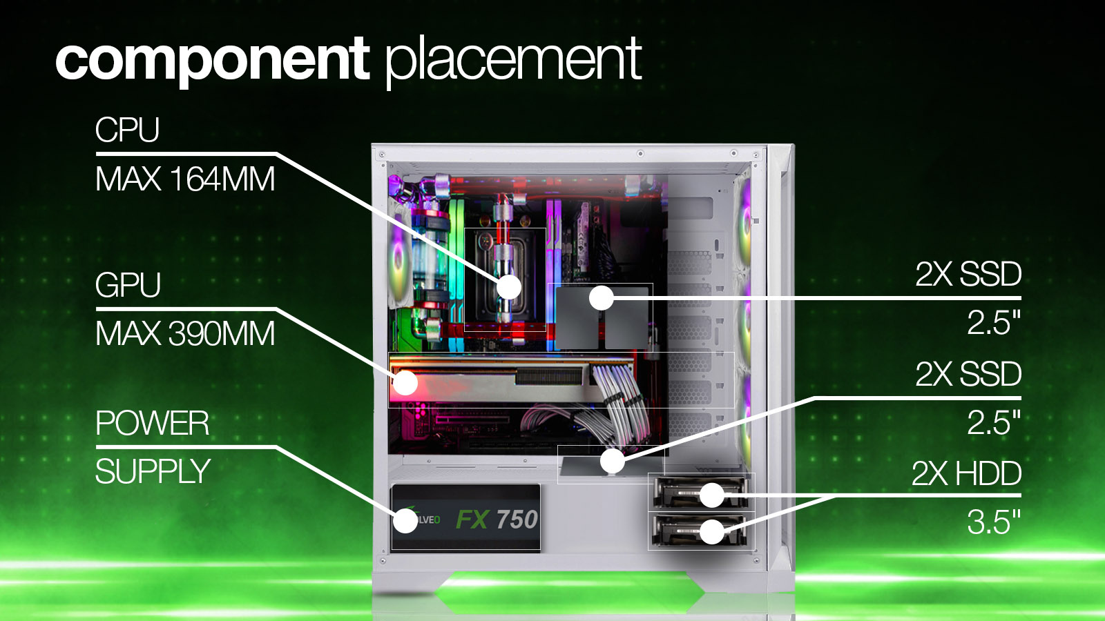 Průhledná odnímatelná bočnice: 1) Vyrobena z bezpečnostního 4 mm silného temperovaného skla (při rozbití se rozsype na bezpečné drobné kousky bez ostrých střepů) 2) Snadná demontáž a montáž pomocí dvou šroubů s dvěma možnostmi utažení (rukou nebo šroubovákem) • 2x 3,5'' HDD • 3x 2,5 '' SSD • Maximální délka VGA karty: 390 mm • Maximální výška CPU chladiče: 164 mm • Robustní konstrukce (plechy o tloušťce 0,6 mm) • Systém „QuintFlow“ pro optimální průtok vzduchu a přirozené chlazení celé skříně díky pěti vzduchovým proudům přes čelní, horní, spodní, zadní a boční voštinové průduchy • Podpora základních desek Intel i AMD • Předinstalované ventilátory ve skříni: 1x ARGB master, 3x ARGB slave •