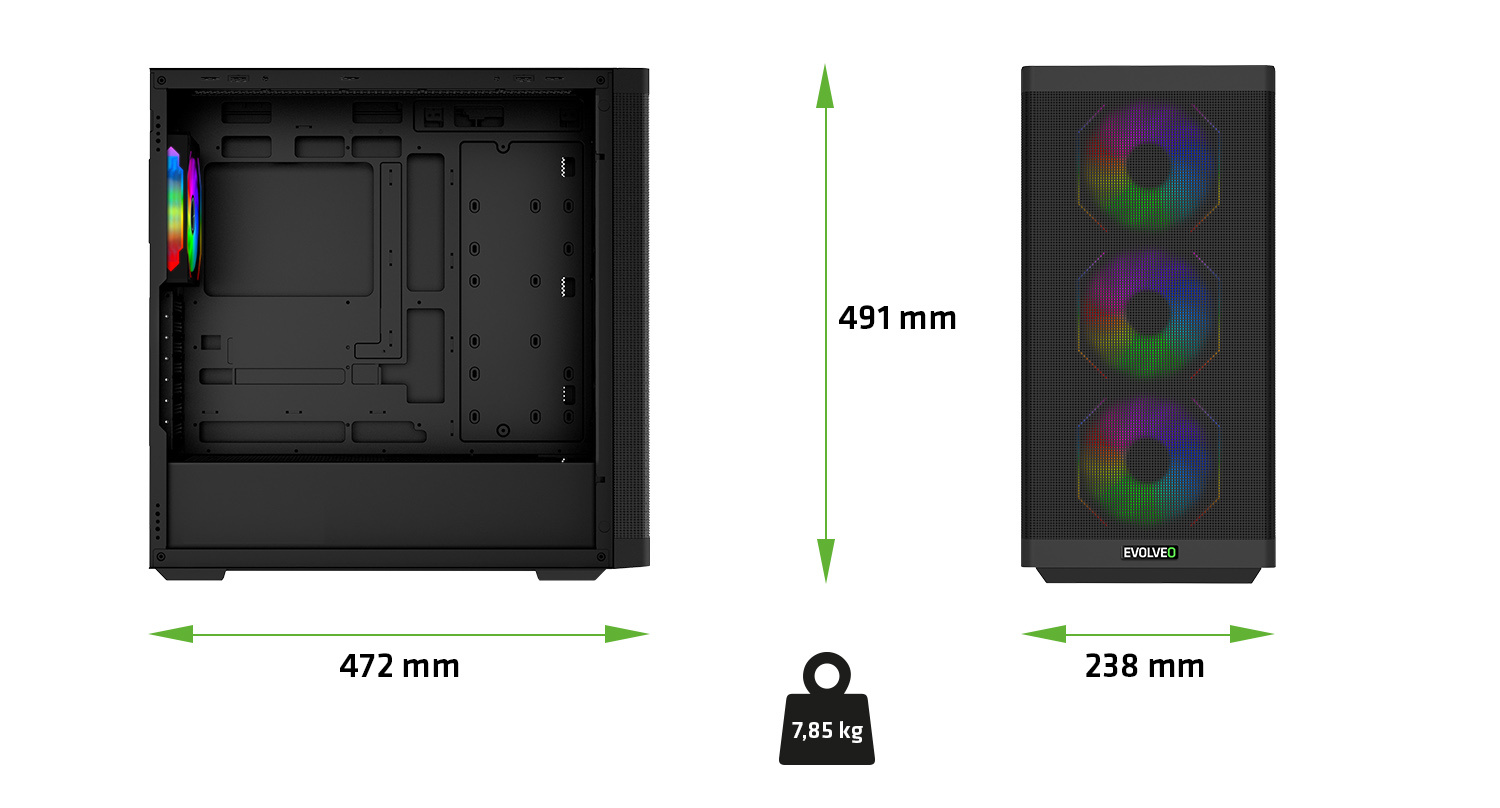 • Big Tower • ATX, eATX, mATX, ITX • Bočnice z temperovaného skla • Mesh čelní panel • Ventilátory ARGB 120 mm • 4x Infinity Mirror Fan • Dva prachové filtry • VGA max. 415 mm • CPU max. 180 mm • 4x 3,5'' HDD • 5x 2,5'' SSD • 2x USB 3.0 + 1x USB-C + 2x Jack 3,5 mm