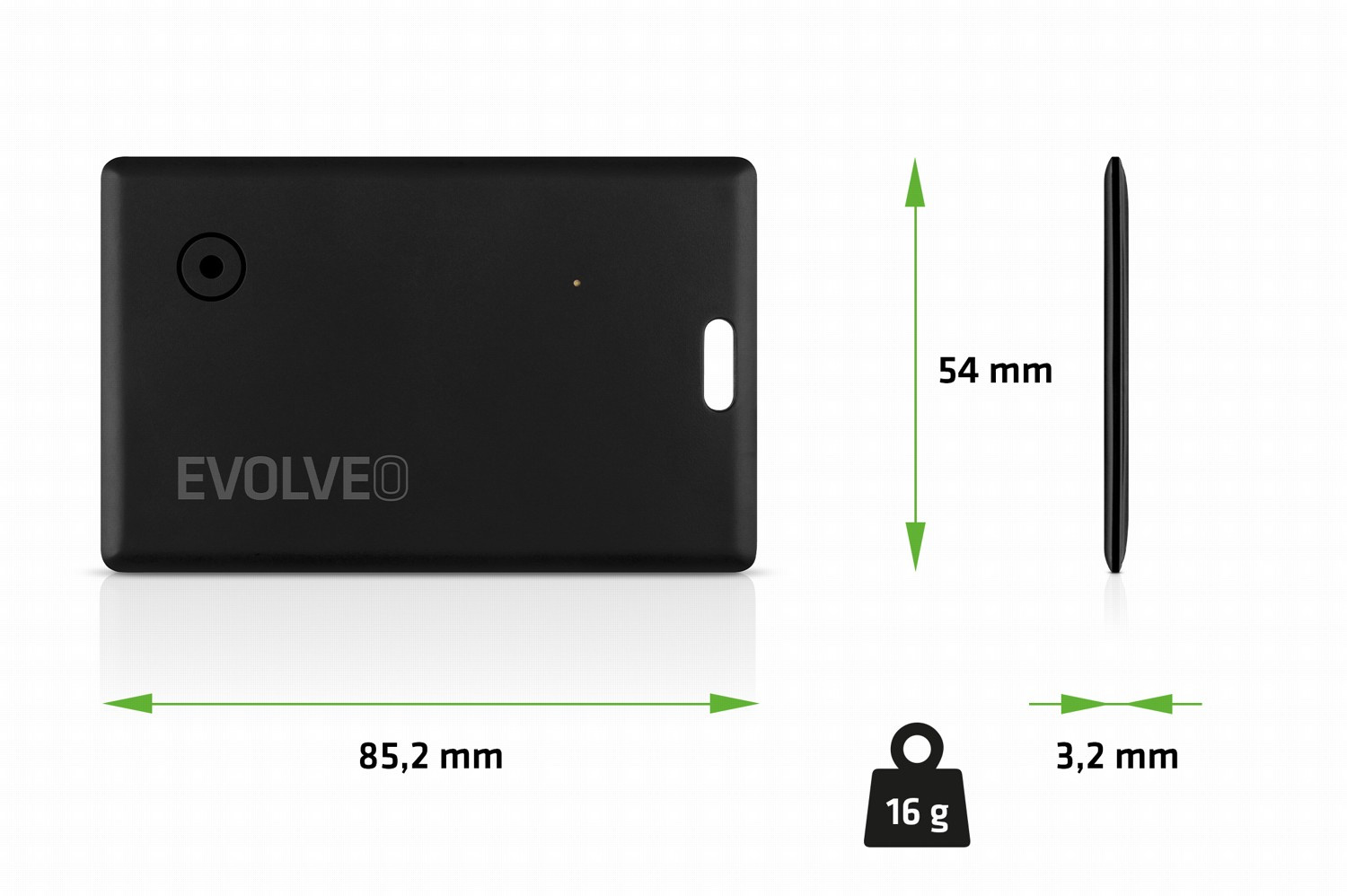 Svou velikostí a tvarem připomíná EVOLVEO TrackCard klasickou platební kartu. S rozměry