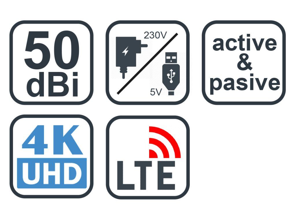• zisk: 50 dBi • filtr LTE, 4G, 5G • VHF: 174-230 MHz (DAB+) • UHF: 470-694 MHz (DVB-T2) • napájení AV 220-240V, DC 5V/550mAKONEKTORY :