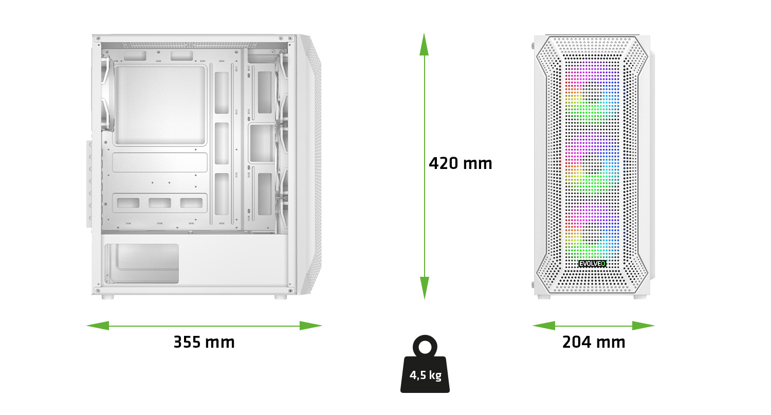 • Průhledná odnímatelná bočnice: 1) Vyrobena z bezpečnostního 4 mm silného temperovaného skla (při rozbití se rozsype na bezpečné drobné kousky bez ostrých střepů) 2) Snadná demontáž a montáž pomocí čtyř šroubů s dvěma možnostmi utažení (rukou nebo šroubovákem) • 2x 3,5'' HDD • 3x 2,5 '' SSD • Maximální délka VGA karty: 330 mm • Maximální výška CPU chladiče: 170 mm • Robustní konstrukce (plechy o tloušťce 0,5 mm) • Systém „QuintFlow“ pro optimální průtok vzduchu a přirozené chlazení celé skříně díky pěti vzduchovým proudům přes čelní, horní, spodní, zadní a boční voštinové průduchy • Podpora základních desek Intel i AMD • Předinstalované ventilátory ve skříni: 1x ARGB master, 3x ARGB slave