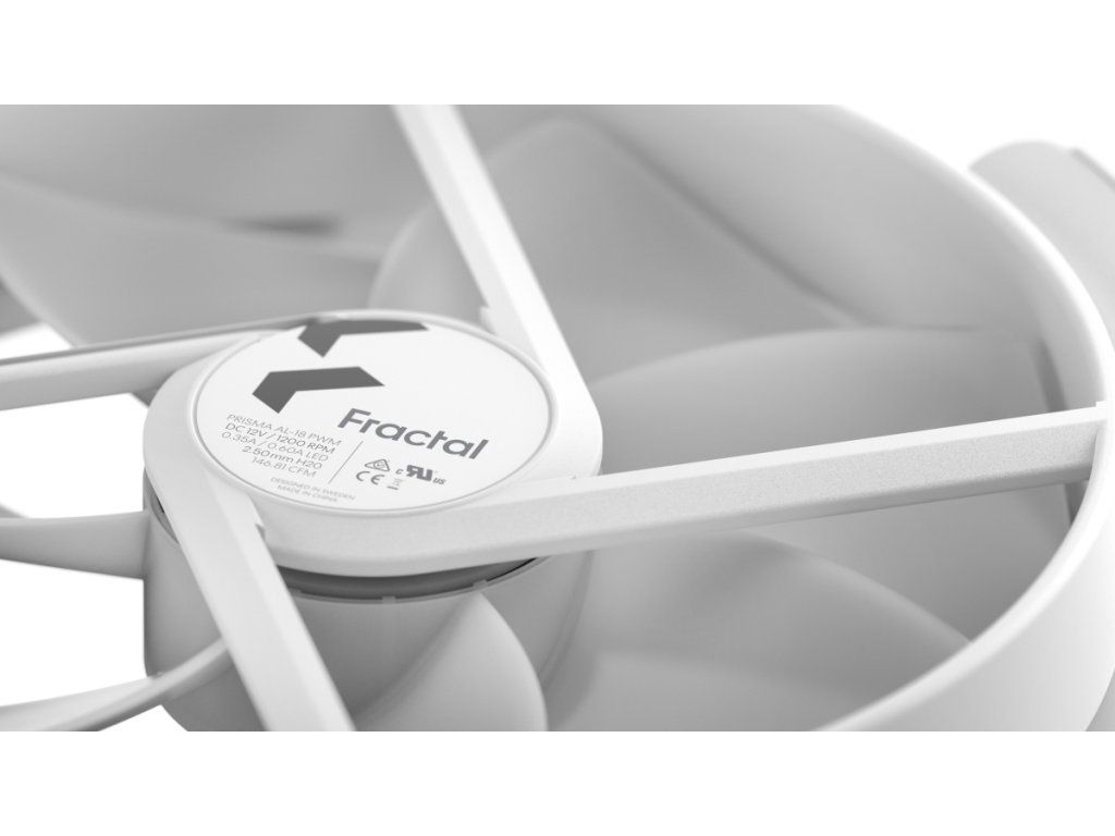 Fractal Design Prisma AL-18 PWM Prisma AL-18 je výkonný 180mm ventilátor ARGB, který má pořádný průtok vzduchu. Masivní lopatky, pevná tloušťka 38 mm a široký rozsah 300-1200 otáček za minutu s PWM regulací umožňují ventilátoru AL-18 dosahovat pozoruhodně vysokého průtoku vzduchu při zachování mimořádné tichosti. *Masivní ventilátor RGB 180 x 38 mm, který zajišťuje pozoruhodně vysoký průtok vzduchu a zároveň je velmi tichý. *Dvanáct individuálně adresovatelných RGB LED diod namontovaných v rozbočovači *Speciálně navržené lopatky ventilátoru a vnější prstenec vytvářejí výjimečně rovnoměrnou záři
