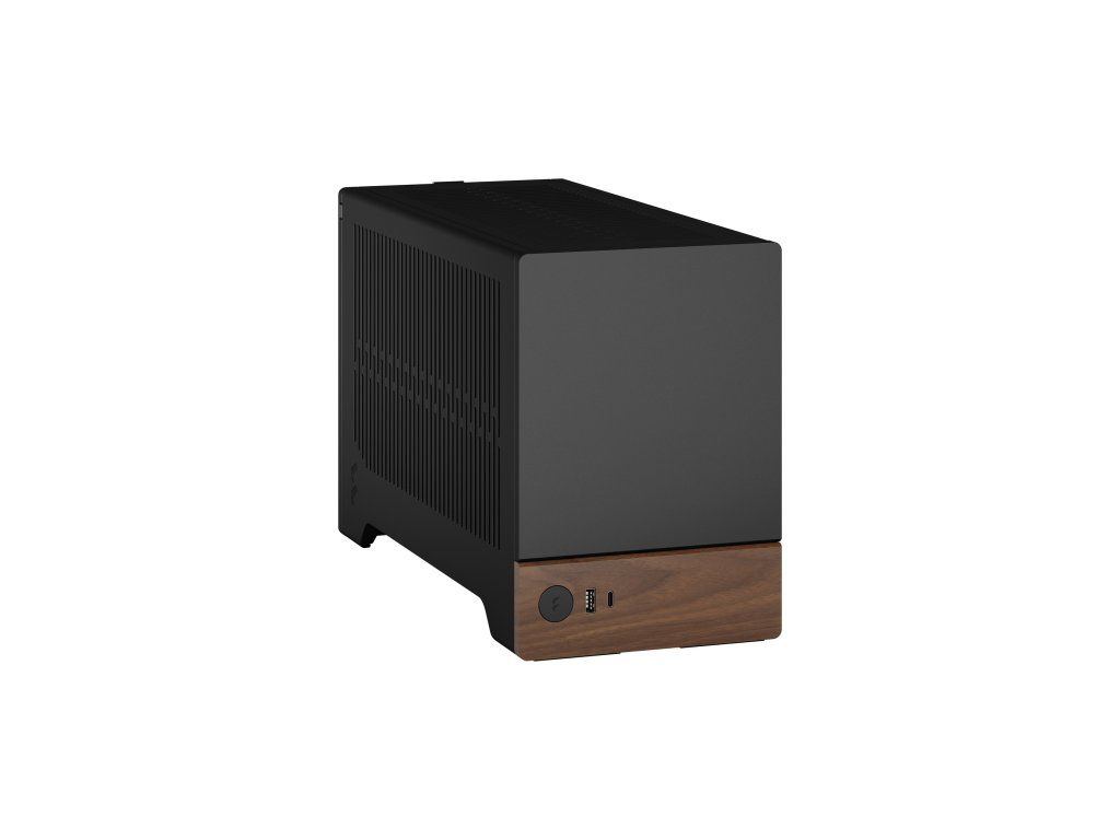 Fractal Terra • malá skříň s objemem 10,4 litrů • přední panel z masivního ořechu s certifikací FSC • přirozené proudění vzduchu přes ventilované horní, boční a spodní panely • plně odnímatelné boční panely pro snadný přístup ke svým komponentům (Push-to-lock bez použití nářadí) • včetně dvou 2,5” držáků disku