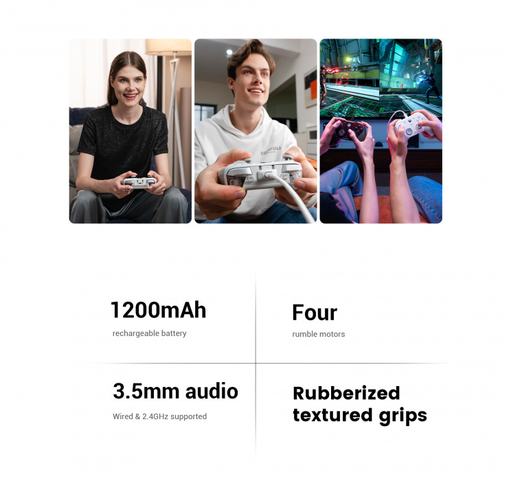 Trojitý režim pripojenia: Hrajte bez obmedzení – káblové pripojenie pre Xbox Series X|S a Xbox One, bezdrôtové 2.4G pre PC a Steam, a Bluetooth pre Android, iOS a Nintendo Switch.