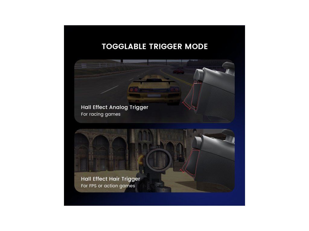 Precízne vyladené analógové spúšťače s technológiou Hallovho efektu ponúkajú bezkonkurenčnú plynulosť a odozvu, čo vám dáva konkurenčnú výhodu v akejkoľvek hre. Pre FPS a akčných hráčov je k dispozícii dokonca rýchle prepnutie do režimu vlasovej spúšte podržaním tlačidiel M+LT/RT. Či už potrebujete presné lineárne ovládanie alebo maximálnu odozvu, vodič G8 vám poskytne konkurenčnú výhodu, ktorú potrebujete.