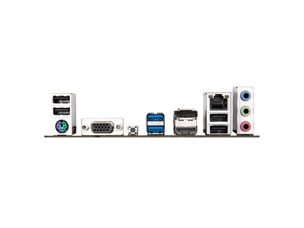 Porty na zadním panelu: * 4x USB 2.0/1.1 * 1x PS/2 pro klávesnici/myš * 1x D-Sub * 1x tlačítko Q-Flash Plus * 2x USB 3.2 Gen 1 * 1x DisplayPort * 1x HDMI * 1x RJ-45 * 3x audio konektor