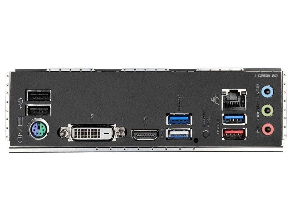 Externí porty: *2x USB 2.0/1.1 ports *1x PS/2 keyboard/mouse port *1x DVI-D port *1x HDMI port *3x USB 3.2 Gen 1 ports *1x USB 3.2 Gen 2 Type-A port (red) *1x Q-Flash Plus button *1x RJ-45 port *3x audio jacks