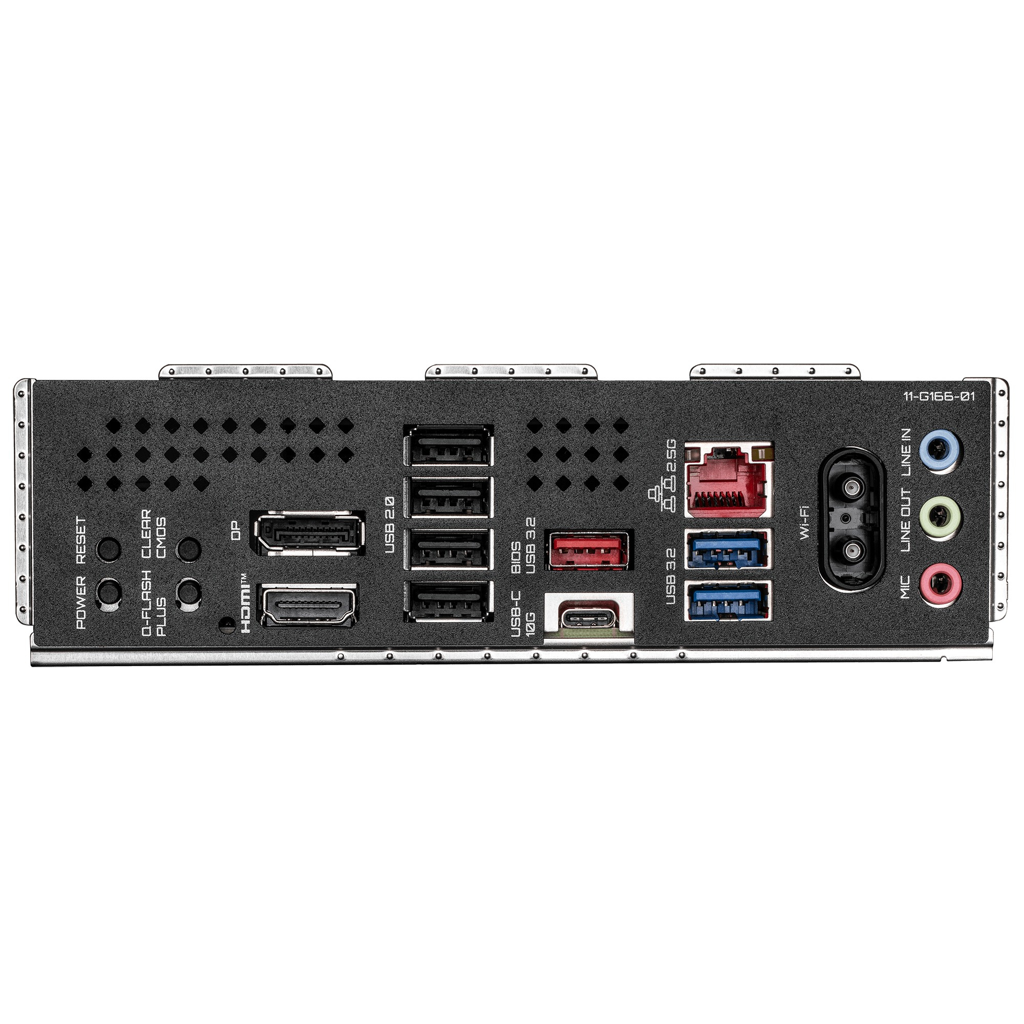 Porty na zadním panelu: *1x tlačítko napájení *1x tlačítko reset *1x tlačítko Q-Flash Plus *1x tlačítko Clear CMOS *1x DisplayPort *1x HDMI *1x USB-C® s podporou USB 3.2 Gen 2 *1x USB 3.2 Gen 2 (červený) *2x USB 3.2 Gen 1 *4x USB 2.0/1.1 *1x RJ-45 *2x anténní konektor (2T2R) *3x audio konektor
