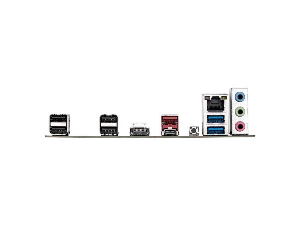 Porty na zadním panelu: * 4x USB 2.0/1.1 * 1x HDMI * 1x USB 3.2 Gen 2 typ A/USB 3.2 Gen 1 (červený) * 1x USB typ C® s podporou USB 3.2 Gen 1 * 1x tlačítko Q-Flash Plus * 1x RJ-45 * 2x USB 3.2 Gen 1 * 3x audio konektor