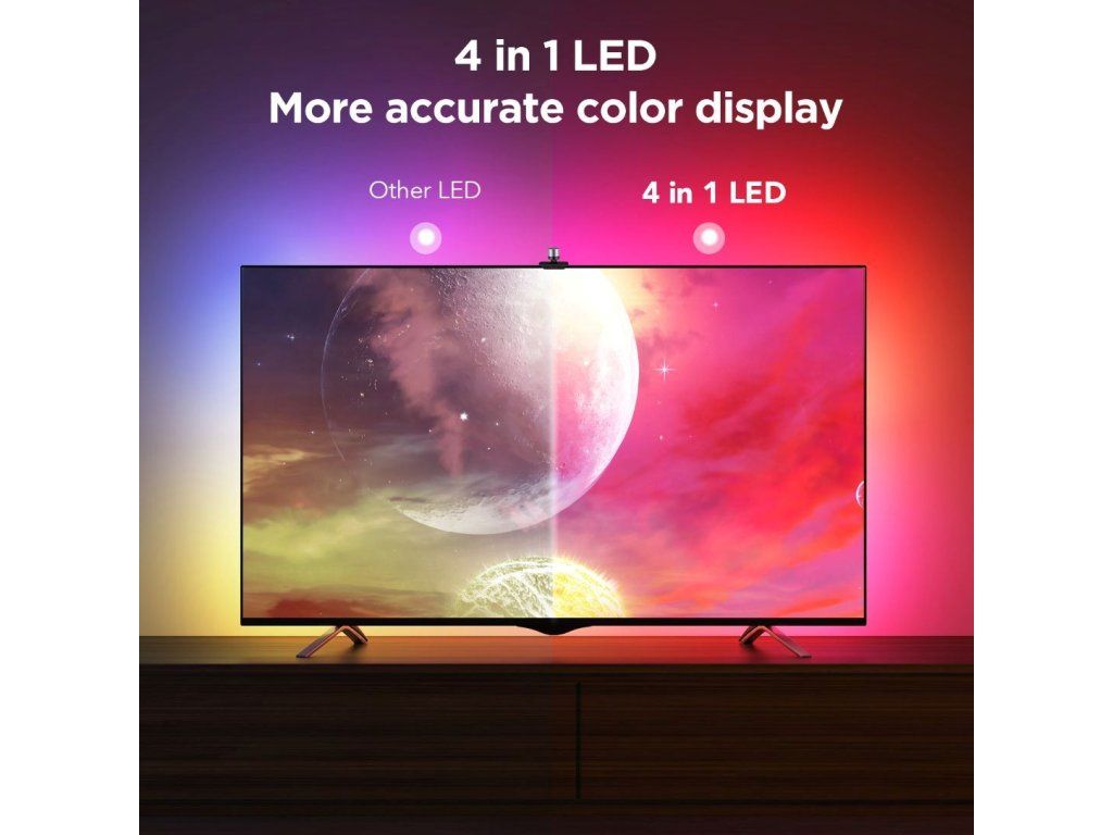 Špeciálna kamera s pokročilou technológiou Envisual inteligentne rozpoznáva a zachytáva farby na obrazovke vašej televízie alebo monitora. Na základe tejto farebnej analýzy automaticky vyhodnotí a nastaví ideálne podsvietenie. Užívajte si synchronizáciu farieb bez oneskorenia, aniž by ste potrebovali HDMI kábel alebo boli obmedzení streamovacími službami.